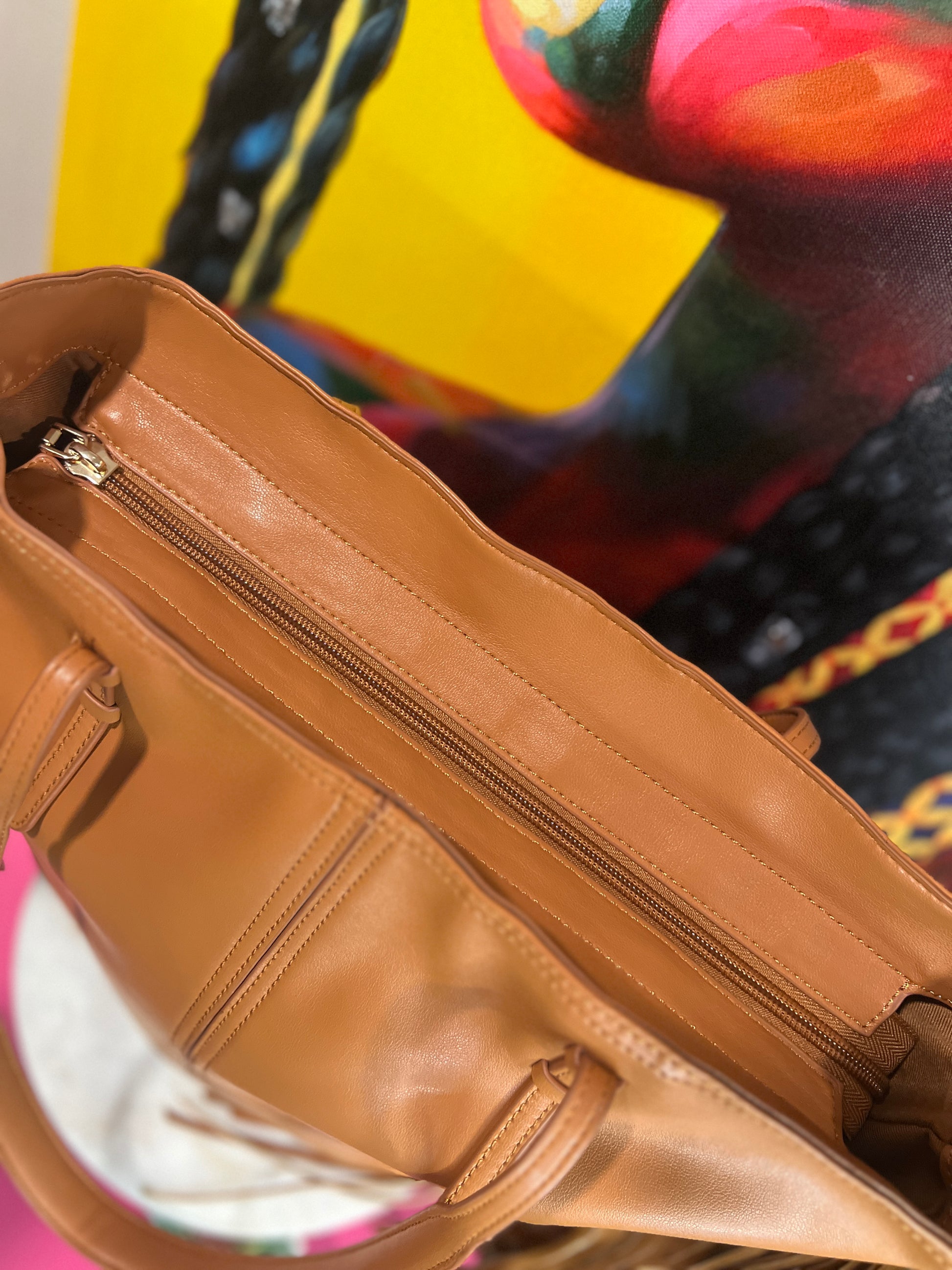 Upgrade your everyday style with this luxurious camel-colored tote, crafted from soft faux butter leather for a smooth and supple feel. Designed for both fashion and functionality, this tote features a large statement tassel that adds a trendy and sophisticated touch. With plenty of space to carry all your essentials, this is the perfect go-to bag for work, travel, or daily errands.
