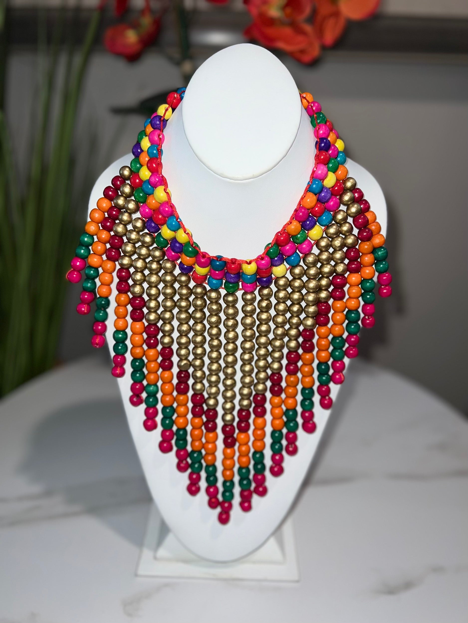 Make a bold statement with the Carnival Cascade Necklace! Featuring vibrant beads in dazzling colors and golden accents, this handcrafted piece is perfect for adding a touch of festive flair to any outfit. Wear it and feel the joy of celebration wherever you go!