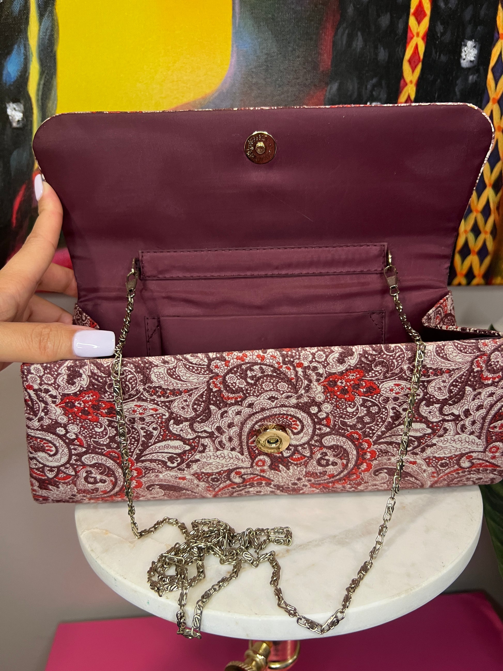 Add a touch of vintage glamour to your look with this stunning paisley print clutch. Featuring an intricate paisley pattern, this clutch is designed for those who love timeless elegance with a hint of sparkle. The bronze rhinestone embellishment adds a luxe touch, making it perfect for evening wear, special occasions, or elevating a casual outfit.