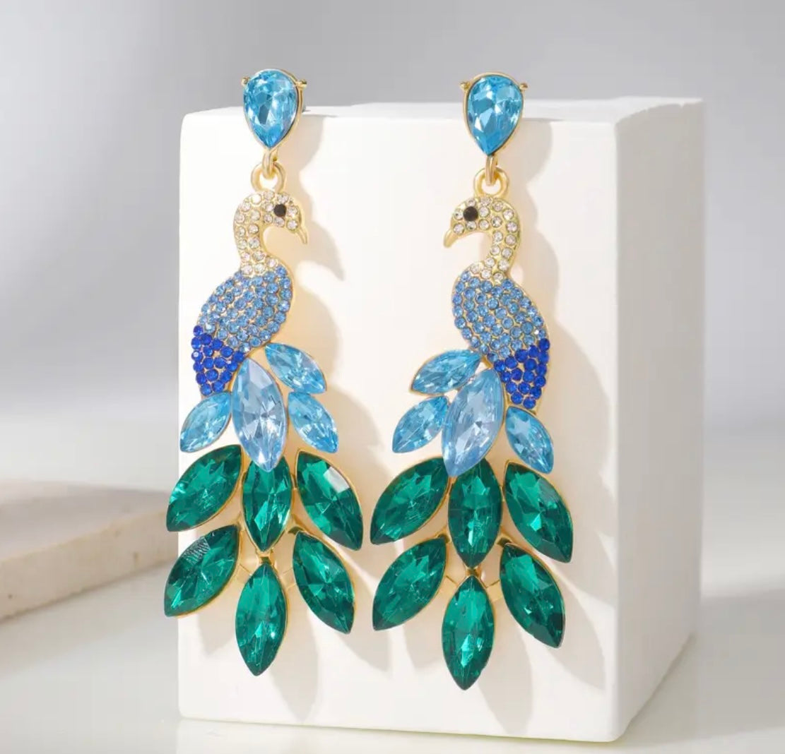 Elevate your look with these captivating peacock-inspired statement earrings. Each earring features a graceful gold-tone peacock adorned with shimmering crystal accents on the head and body, leading to a vibrant fan of marquise-cut stones in rich teal and aqua hues. A faceted teardrop gem at the top adds an extra touch of sparkle and sophistication. Designed with pierced backs for comfortable wear, these eye-catching earrings bring a luxurious pop of color and an exotic flair to any outfit—perfect for special occasions or whenever you want to make a bold style statement.