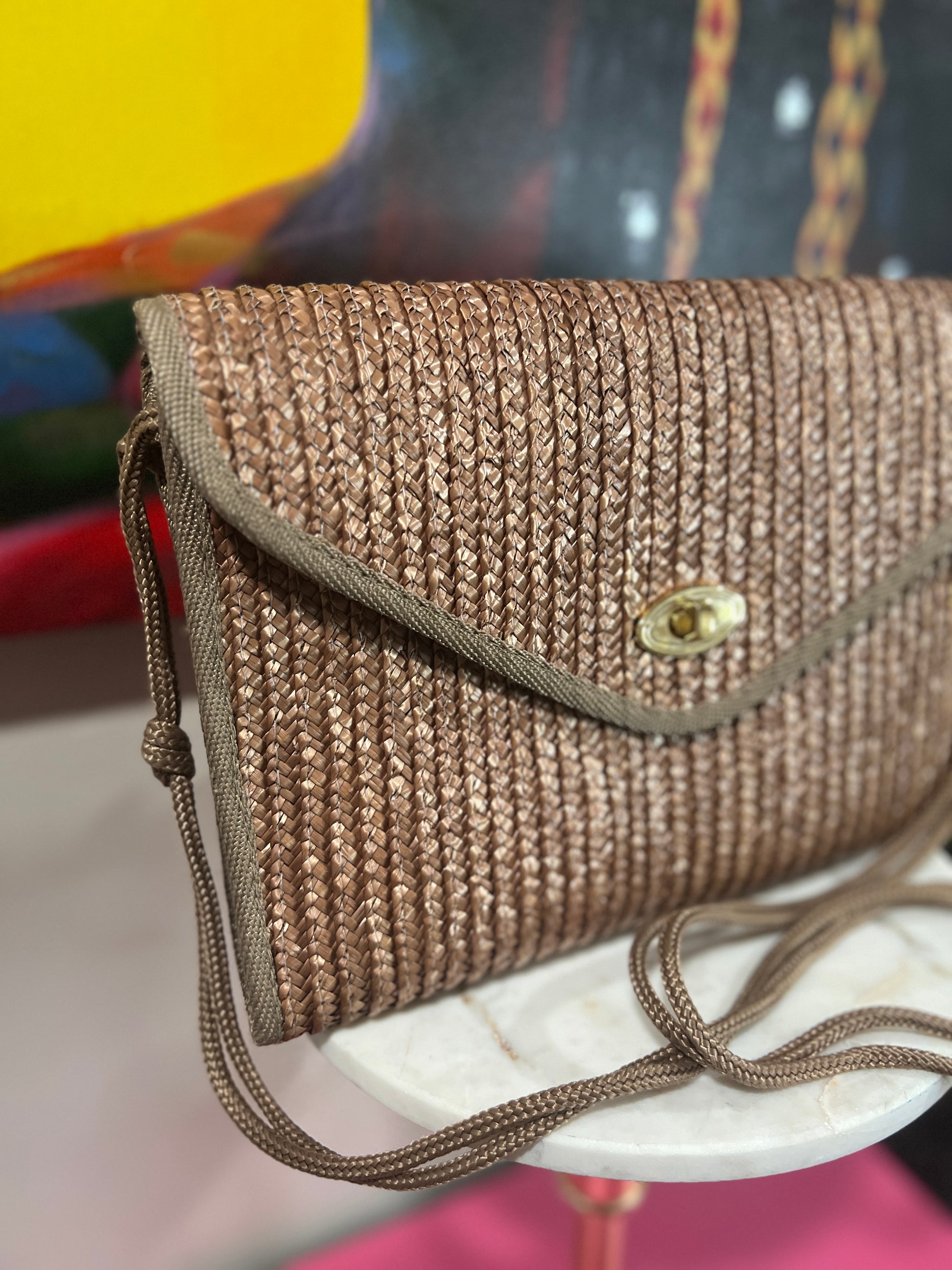 Elevate your accessory game with this vintage woven crossbody bag! Designed with a beautifully textured brown woven body, this bag exudes a timeless, earthy charm. The envelope-style flap features a secure gold-tone twist-lock closure, while the durable corded strap ensures comfortable wear. Whether you're styling it for a casual day out or a breezy evening look, this bag is the perfect blend of function and fashion.